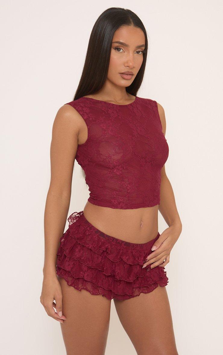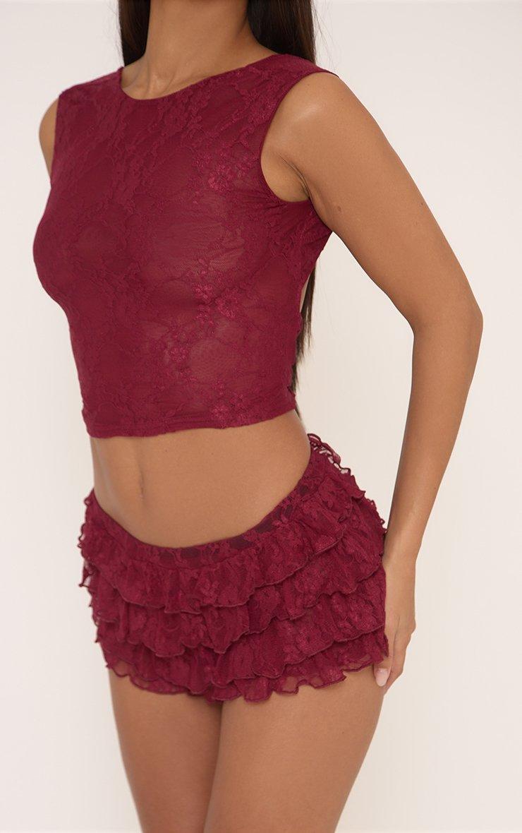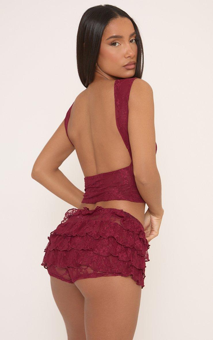 Low Rise Tiered Frill Micro Shorts In Burgundy Lace