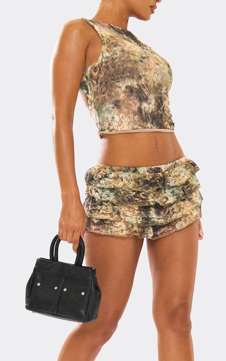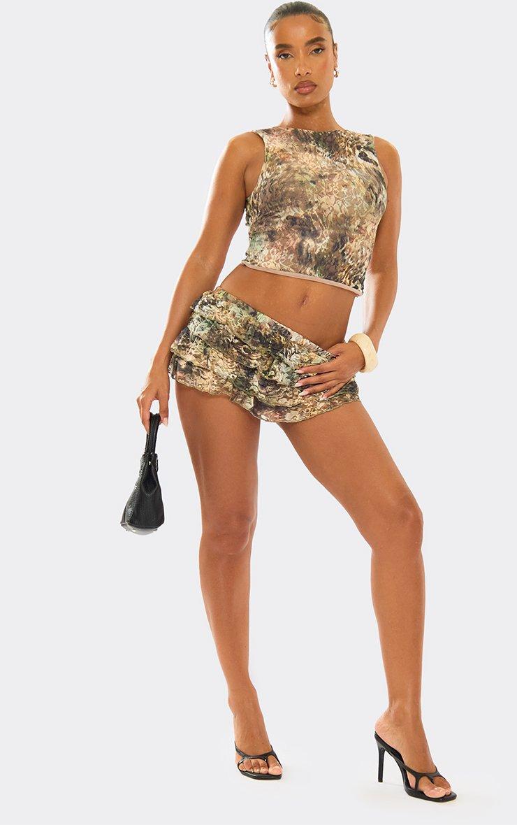 Mid Rise Puffball Frill Hem Shorts In Green Textured