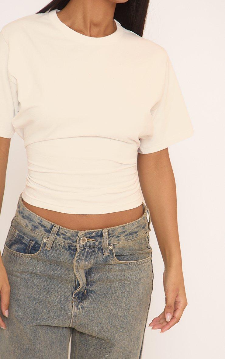 Long Sleeve Asymmetric Cinched Waist Ruched Detail Top In Cream