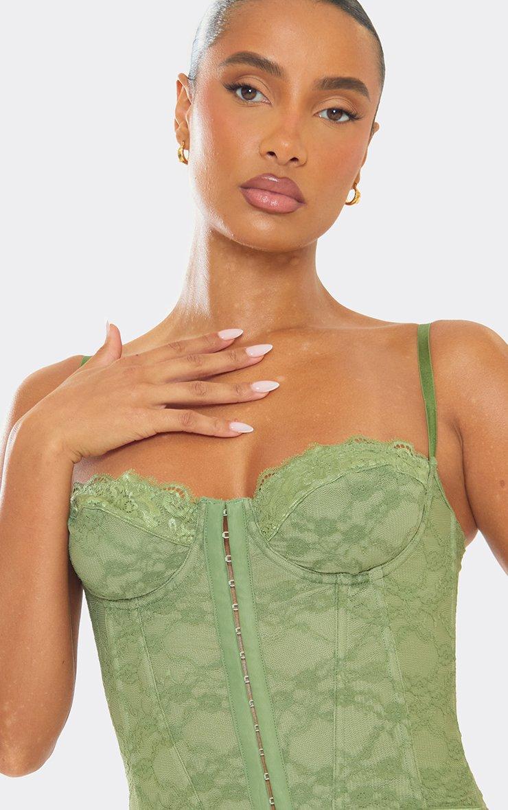Strappy Underwire Corset Detail Bodysuit In Sage Green Lace