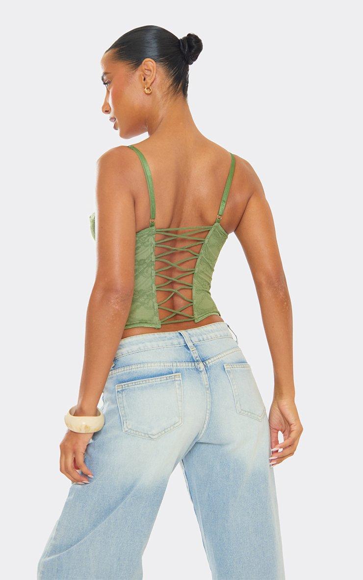 Scoop Neck Strappy Corset Top In Khaki Green Lace