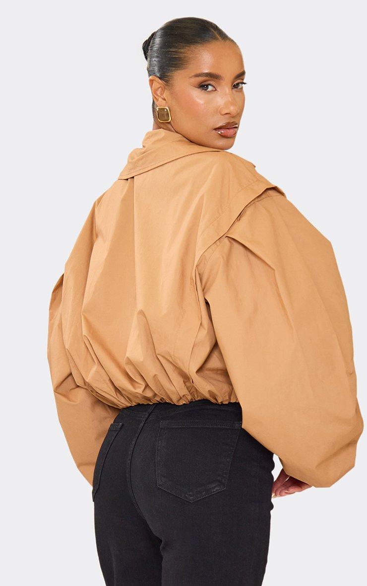 Long Sleeve Cinched Waist Cropped Wool Look Trench Jacket In Beige