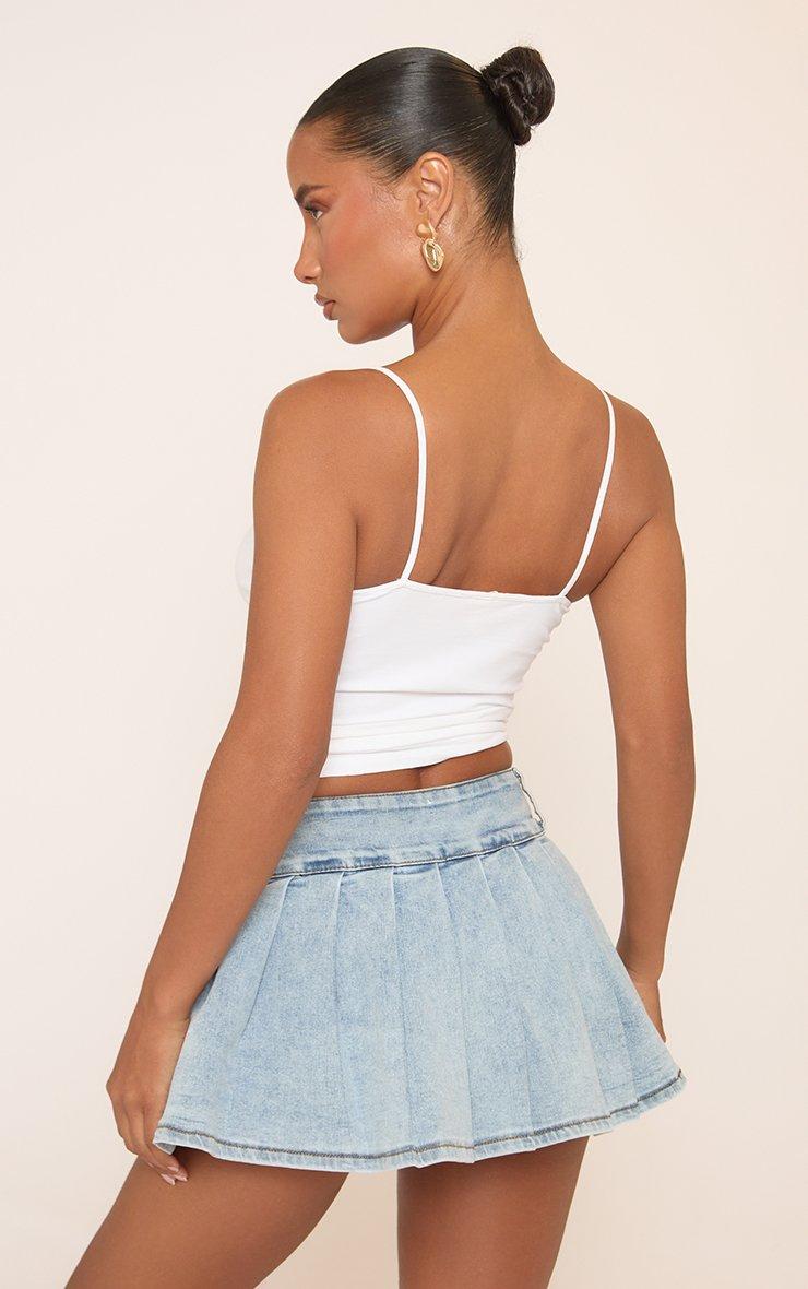 Mid Rise Chunky Belt Detail Side Split Pleated Mini Skort In Blue Denim