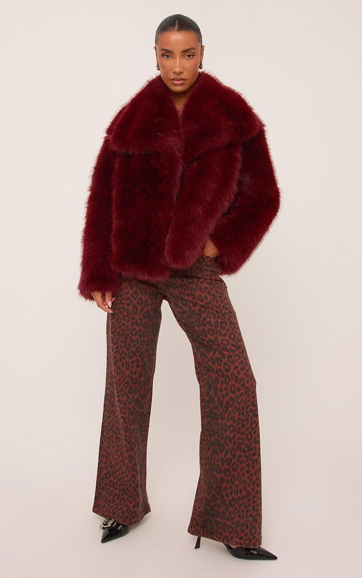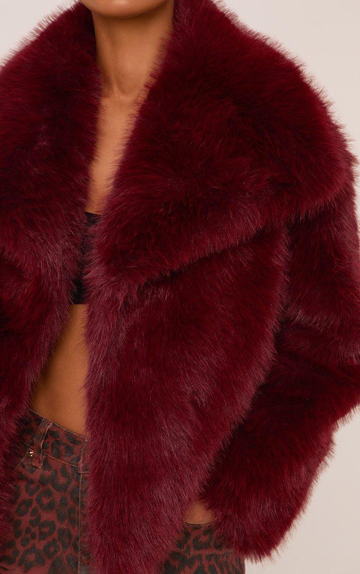 Oversized Collar Coat In Burgundy Red Faux Fur