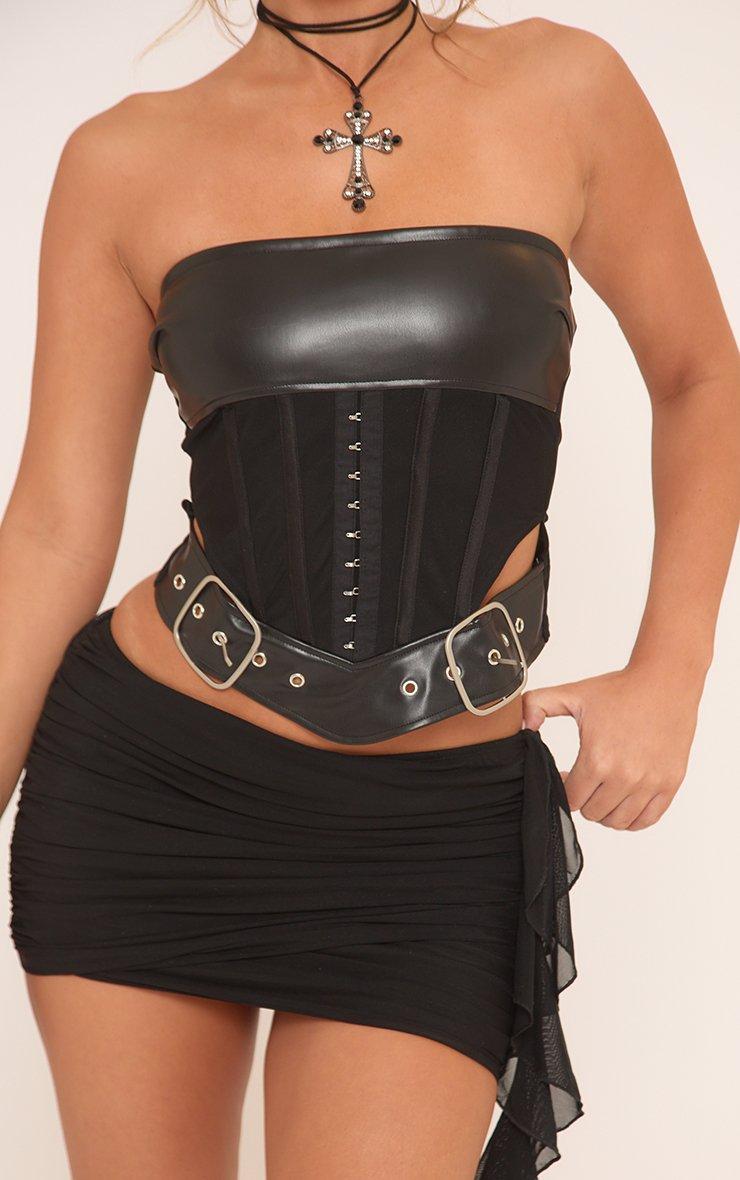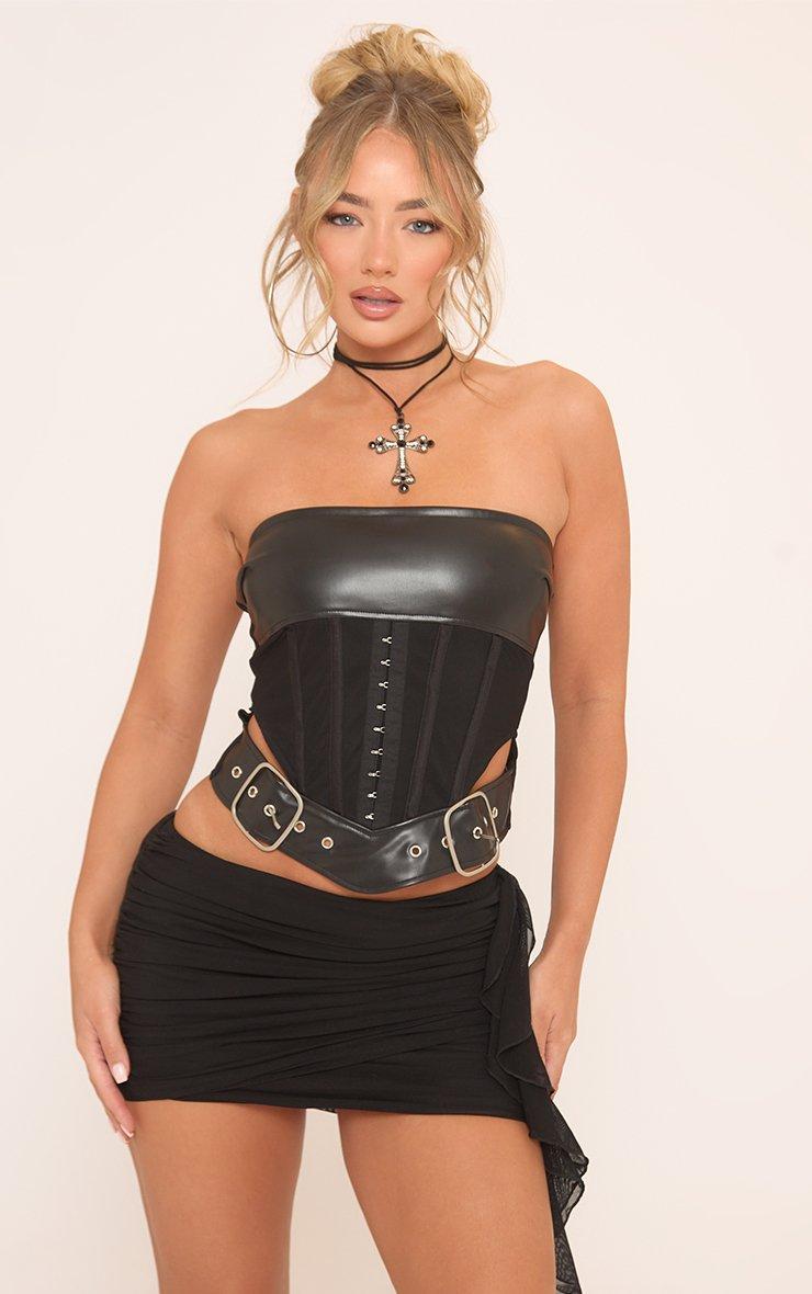 Bandeau Hook And Eye Contrast Faux Leather Corset Top In Black Mesh