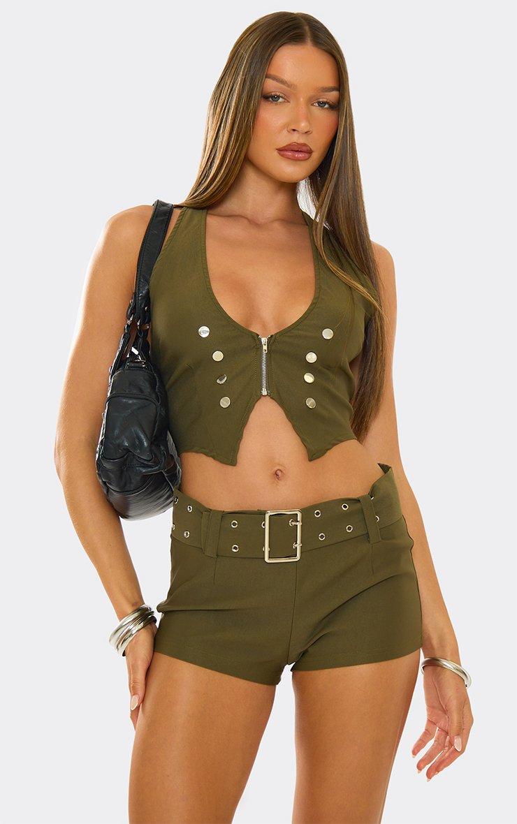 Strappy Wrap Over Front Detail Top In Green Linen