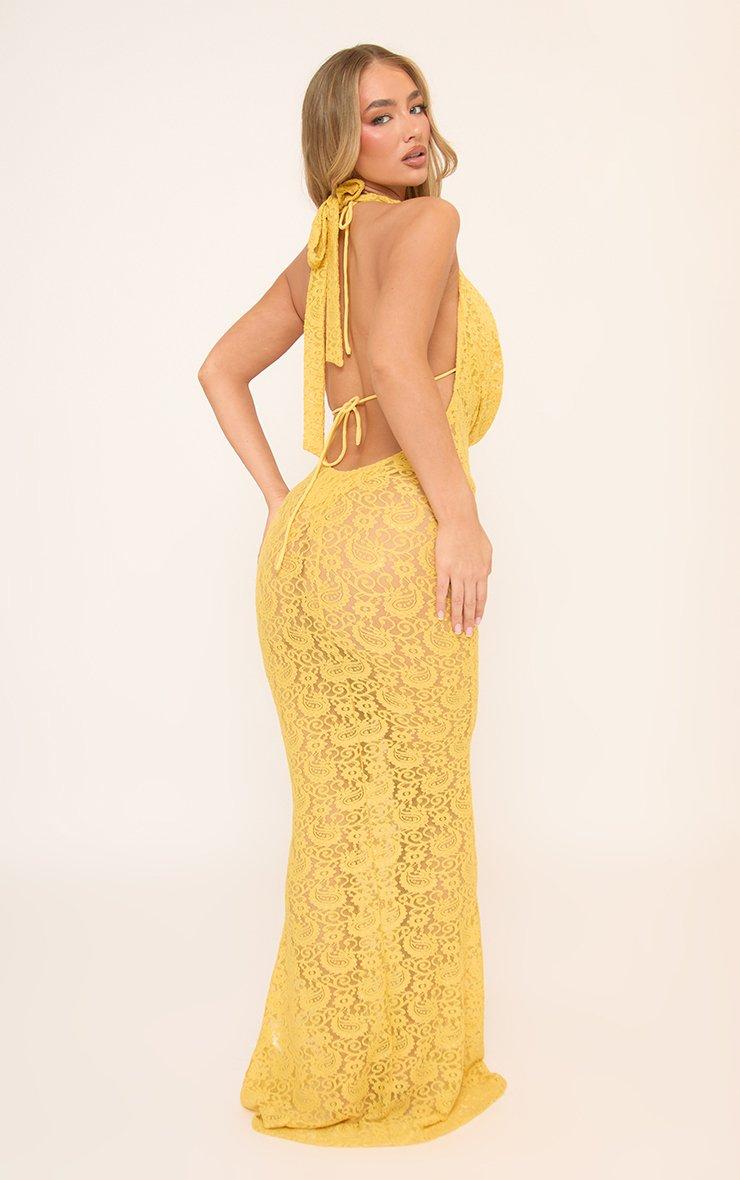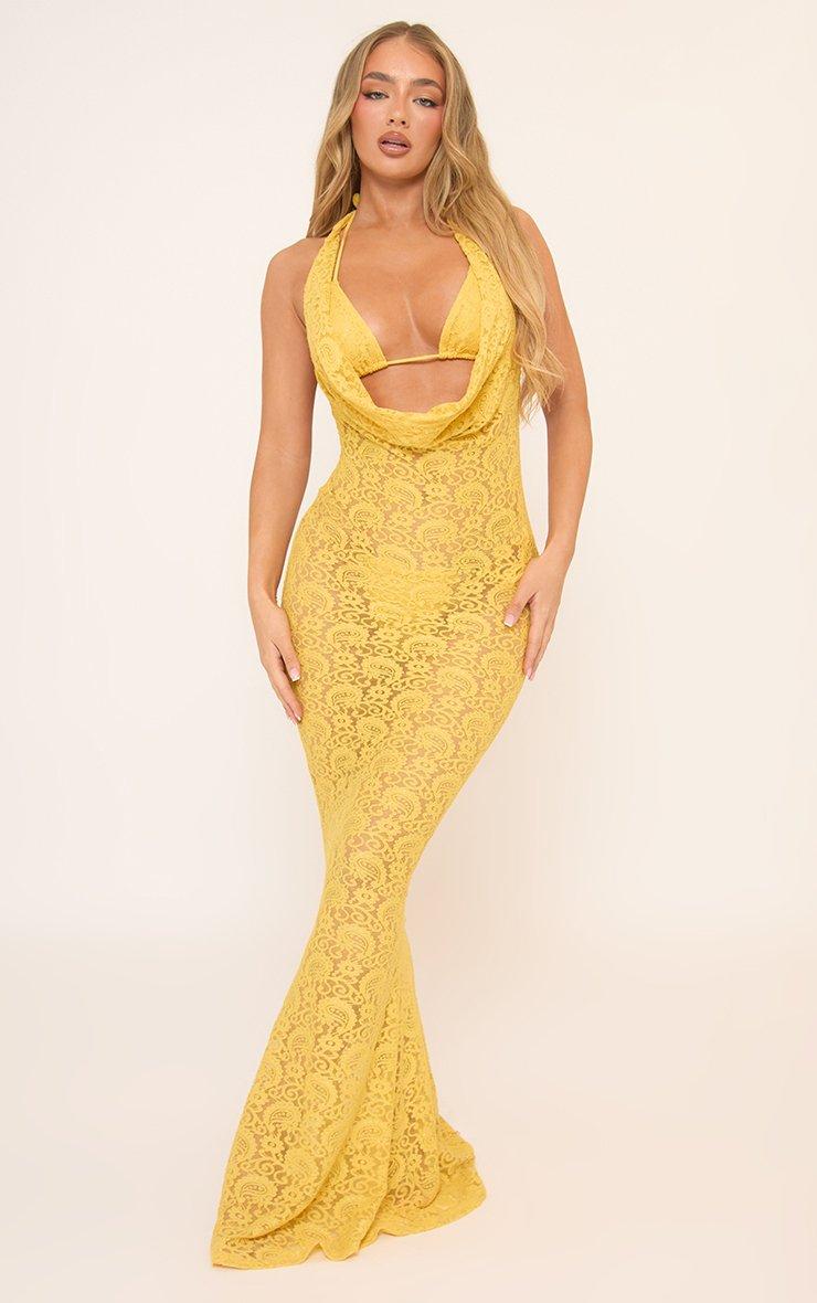 Dipped Waist Ruched Front Maxi Skirt In Yellow Lace