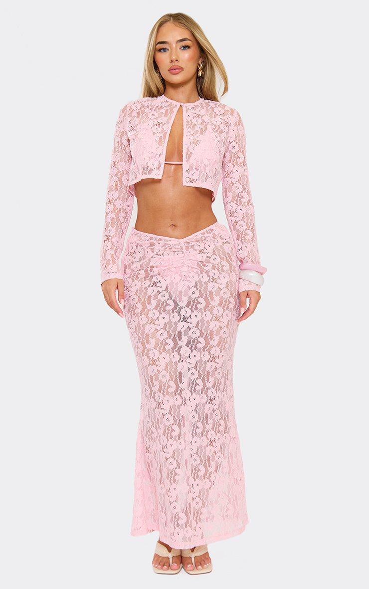 Dipped Waist Ruched Front Maxi Skirt In Baby Pink Lace