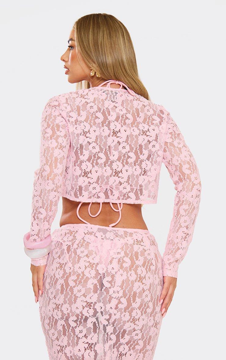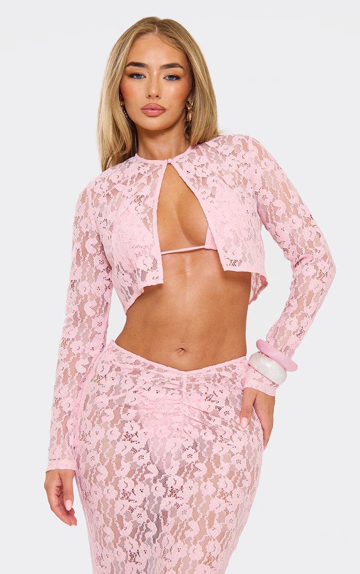 Long Sleeve Button Split Front Cropped Shirt In Baby Pink Lace