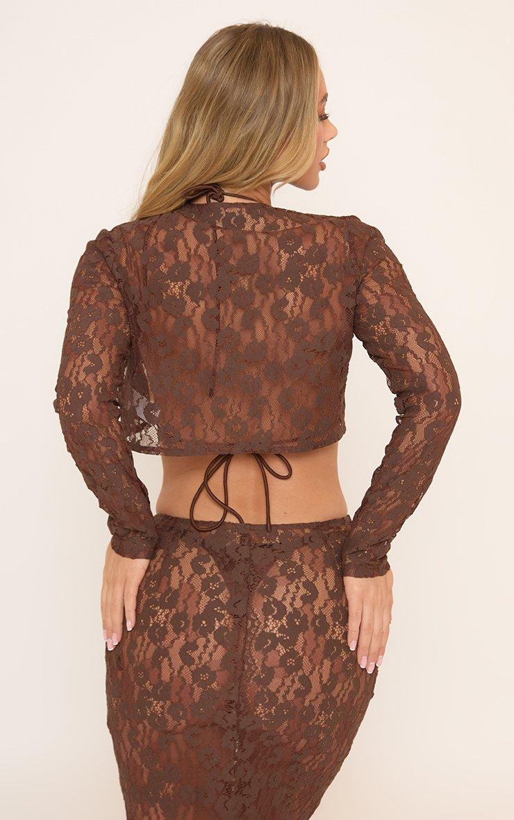 Long Sleeve Button Split Front Cropped Shirt In Brown Lace