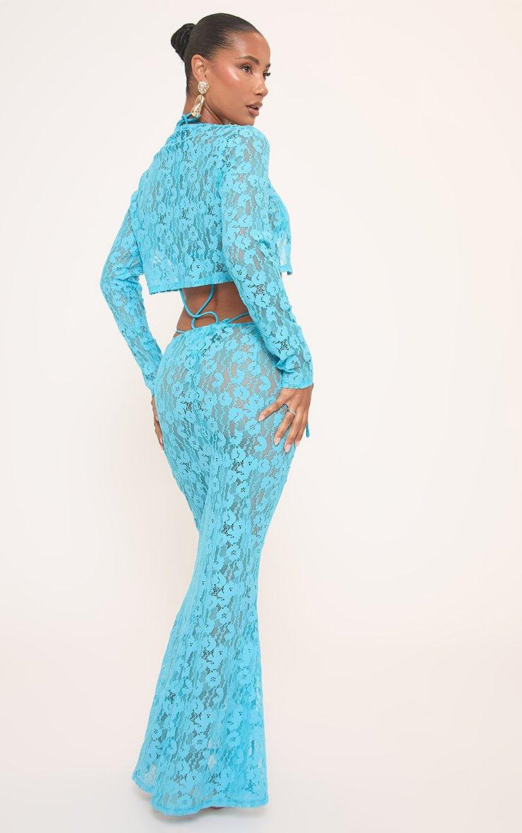 Long Sleeve Button Split Front Cropped Shirt In Blue Lace