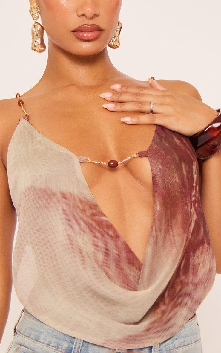 Cowl Halterneck Beaded Strap Top In Brown Multi Print Mesh