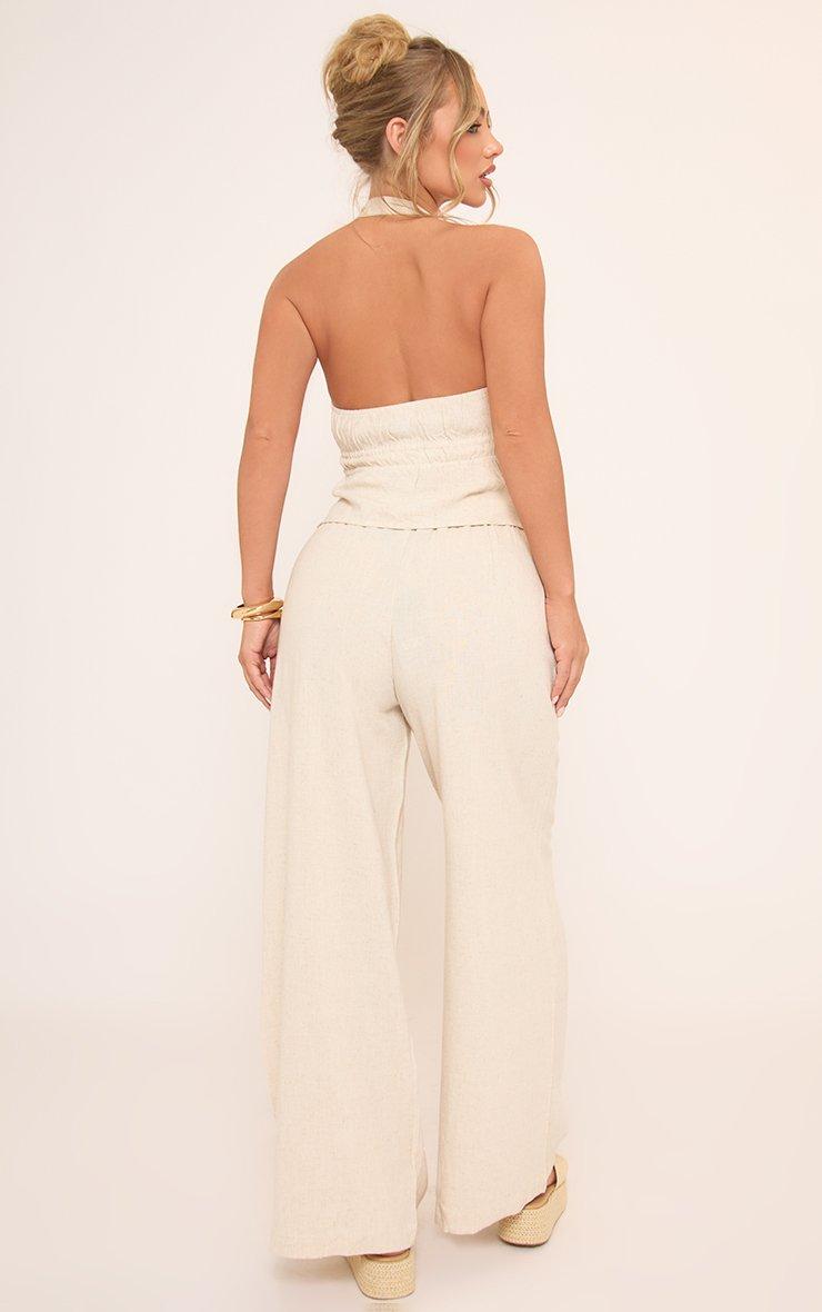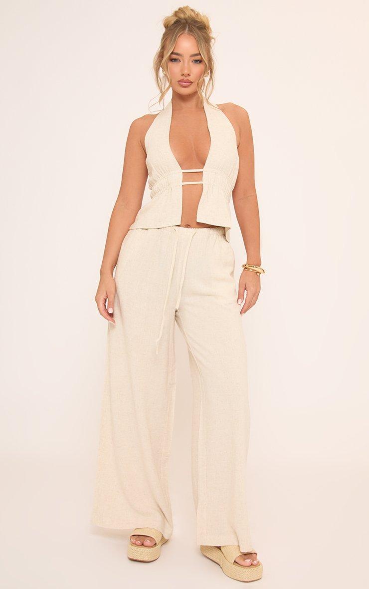 Mid Rise Elasticated Drawstring Waist Detail Wide Leg Trousers In Stone Linen