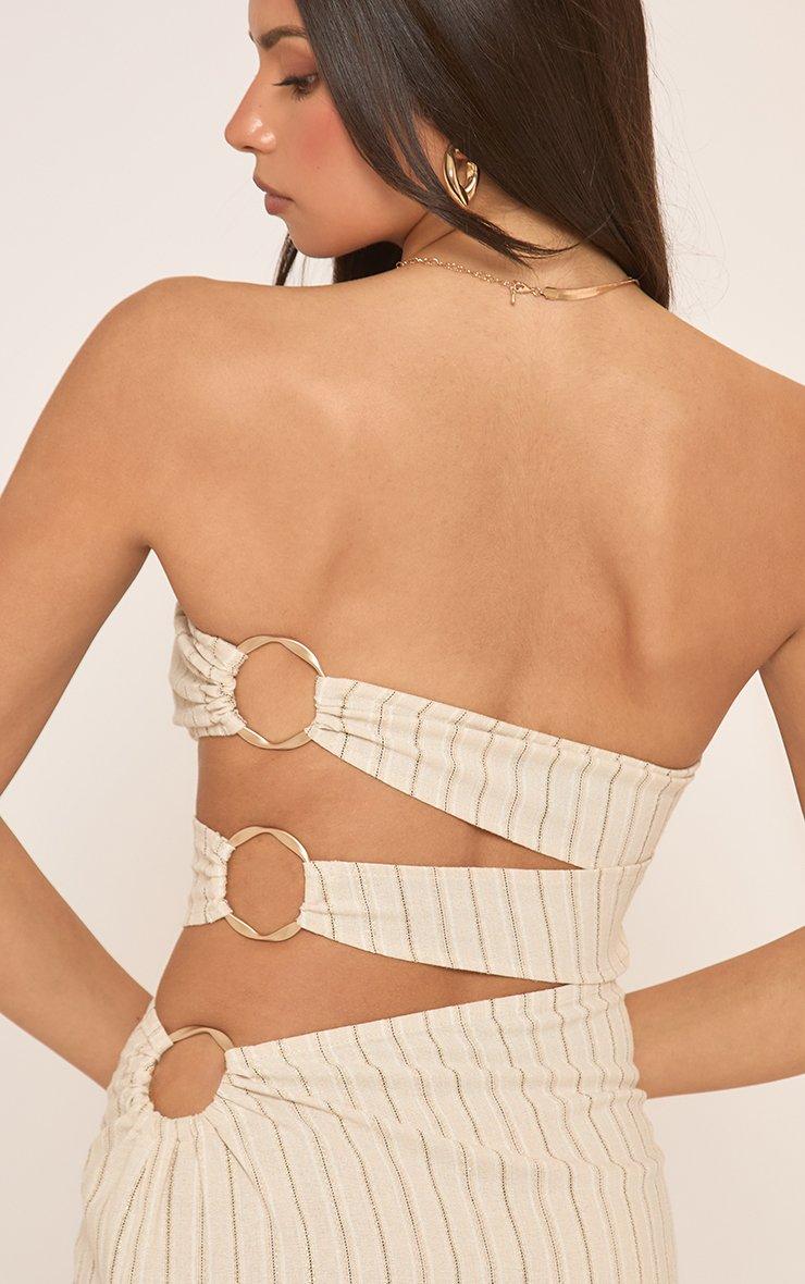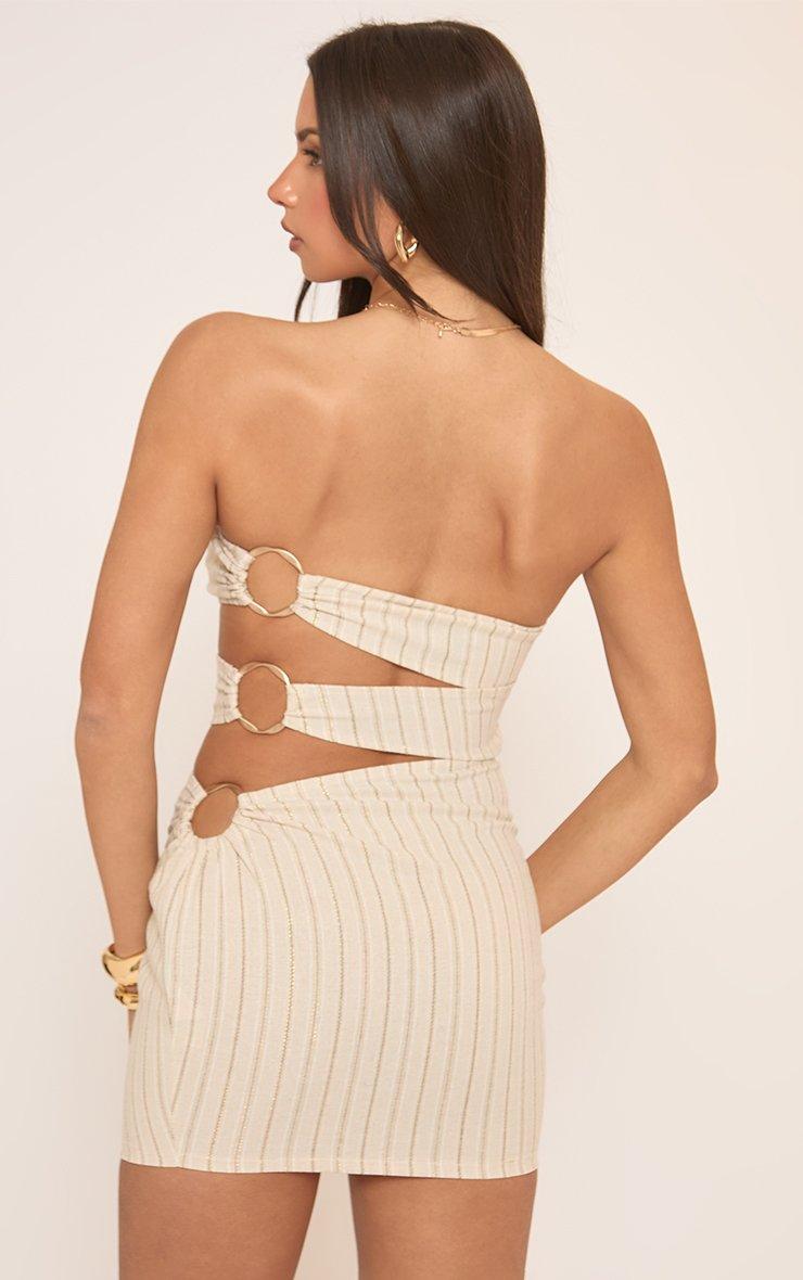 Bandeau Cut Out Mini Dress In Stone Striped Linen