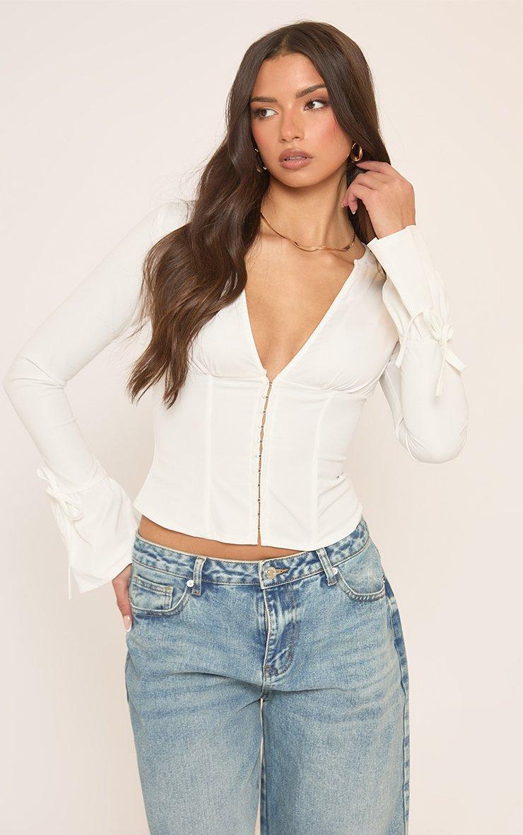 Long Sleeve Hook And Eye Detail Shirt In White Cotton Poplin