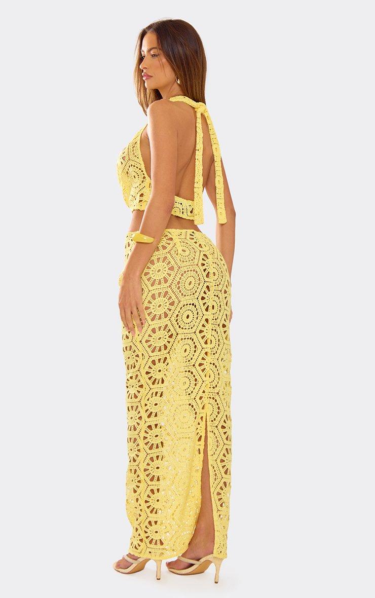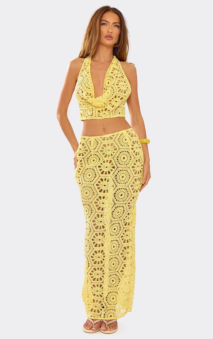 Dipped Waist Ruched Front Maxi Skirt In Yellow Lace