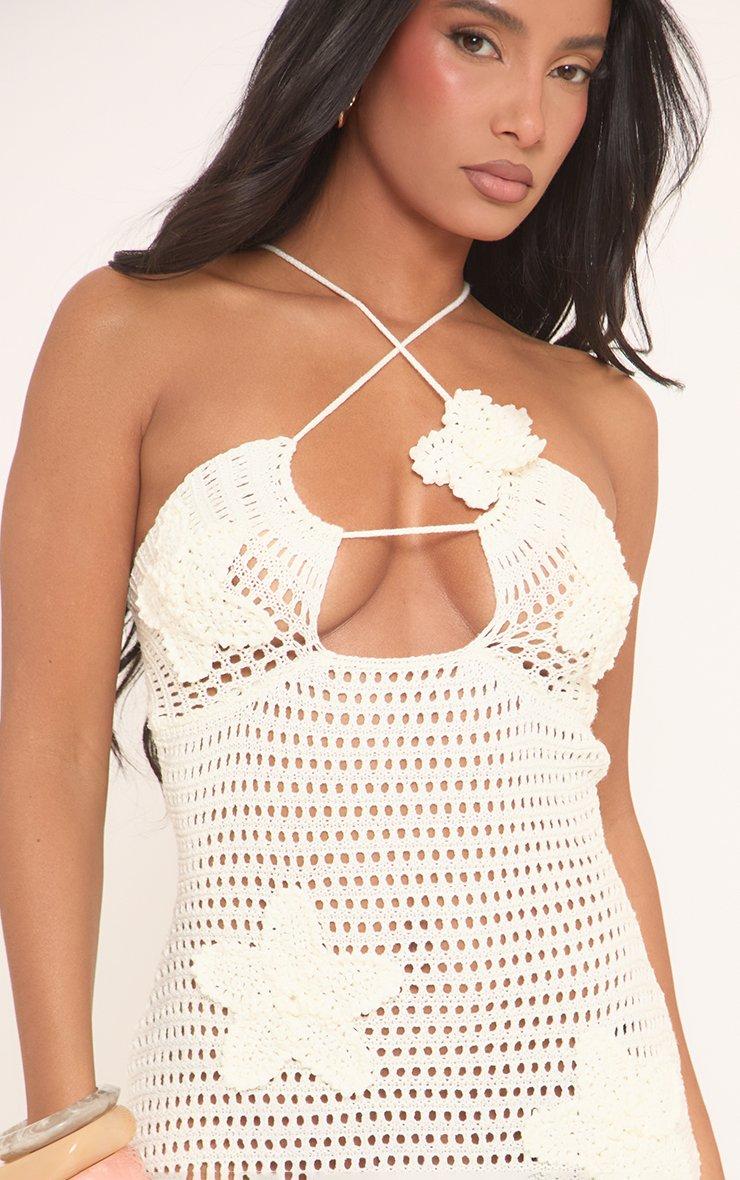 Halterneck Flower Applique Cut Out Mini Dress In Cream Crochet Knit