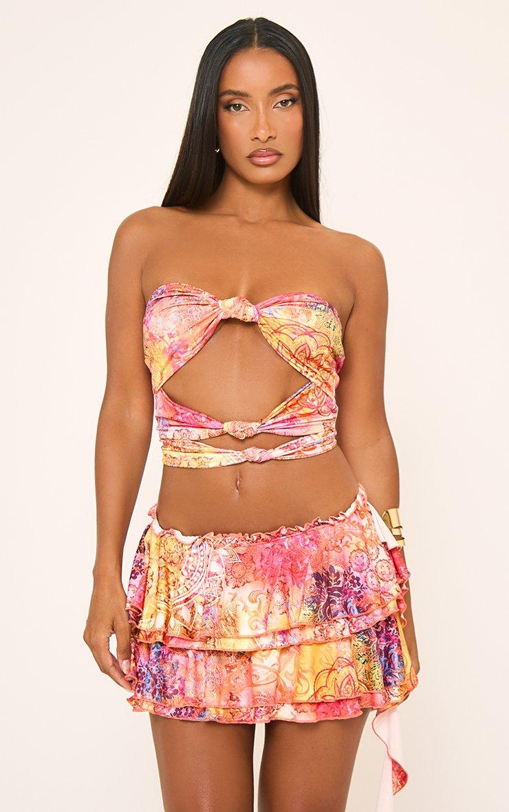 bandeau cut out knot front detail crop top in pink paisley print