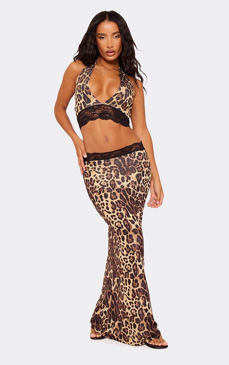 mid rise contrast lace hem maxi skirt in brown leopard print