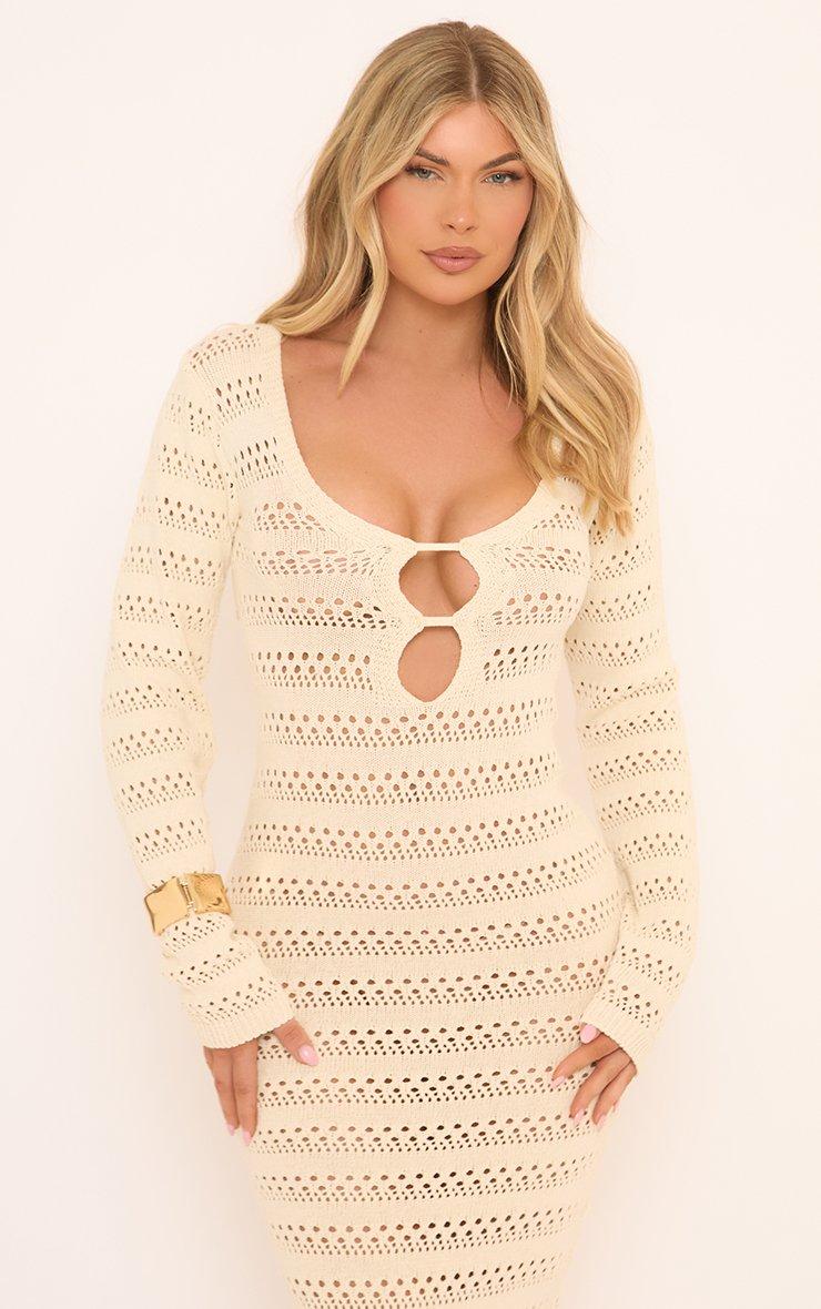 Long Sleeve Plunge Keyhole Detail Maxi Dress In Cream Crochet Knit