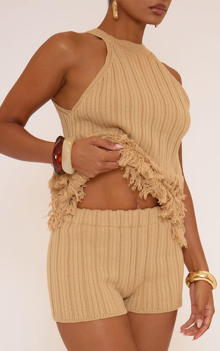 Mid Rise Beach Shorts In Stone Crochet Knit