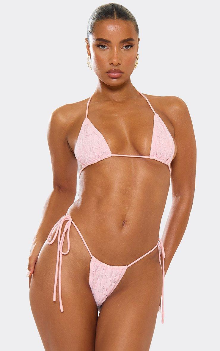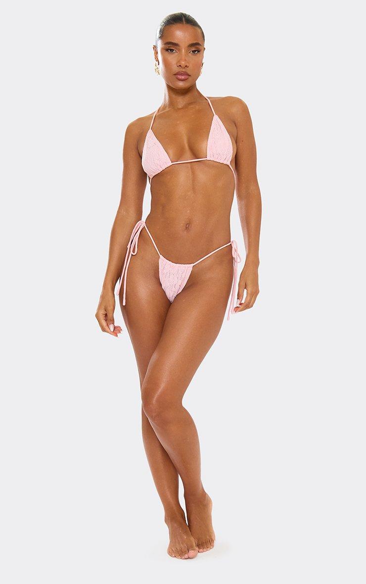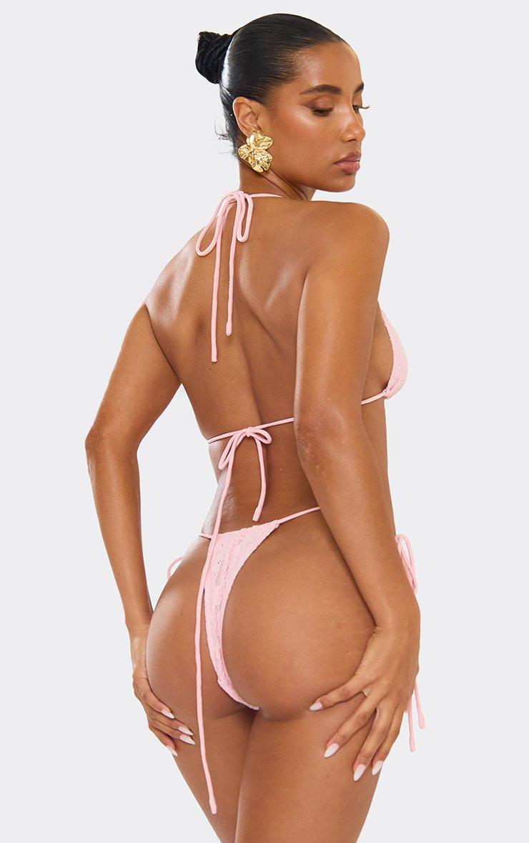 Triangle Tie Side Thong Bikini Set In Baby Pink Lace