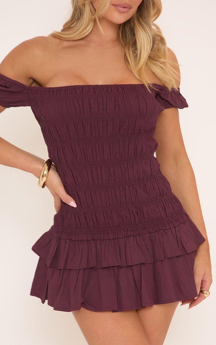 Bardot Frill Hem Detail Shirred Mini Dress In Purple