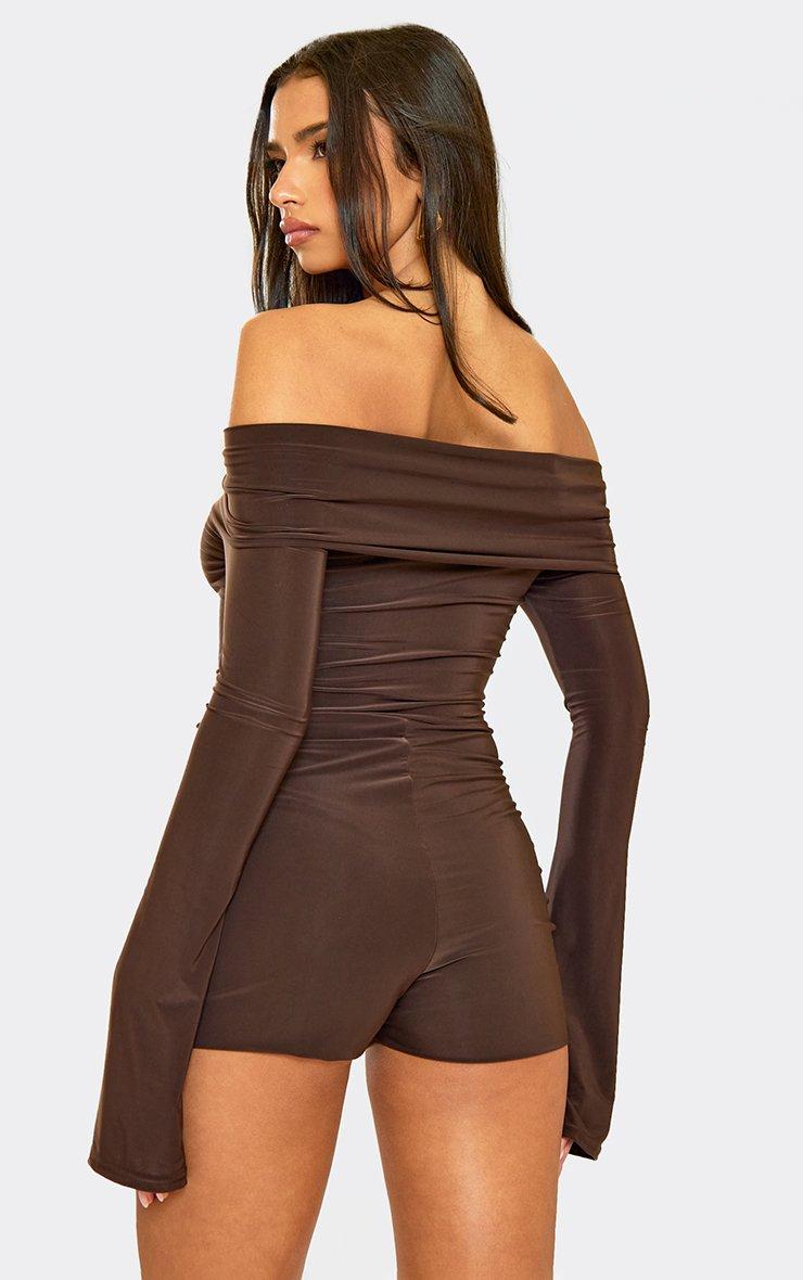 Long Flute Sleeve Double Layered Playsuit In Brown Slinky