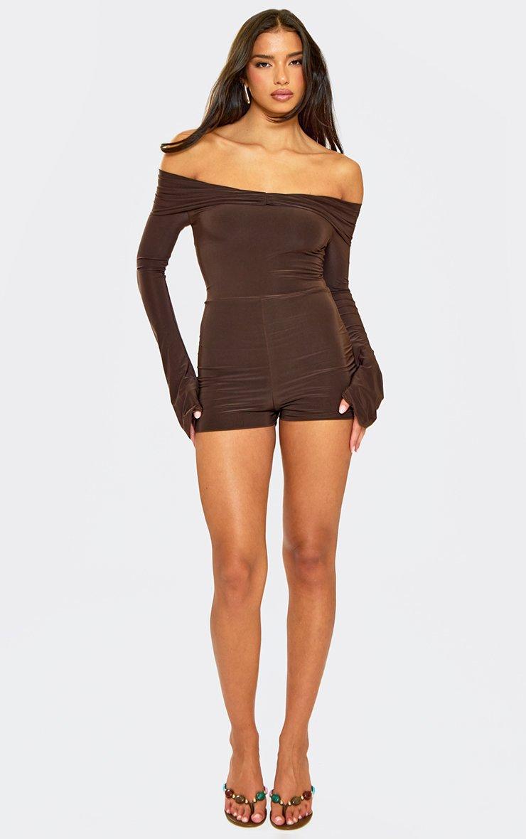 Long Sleeve Cinched Waist Tailored Playsuit In Chocolate Brown Woven