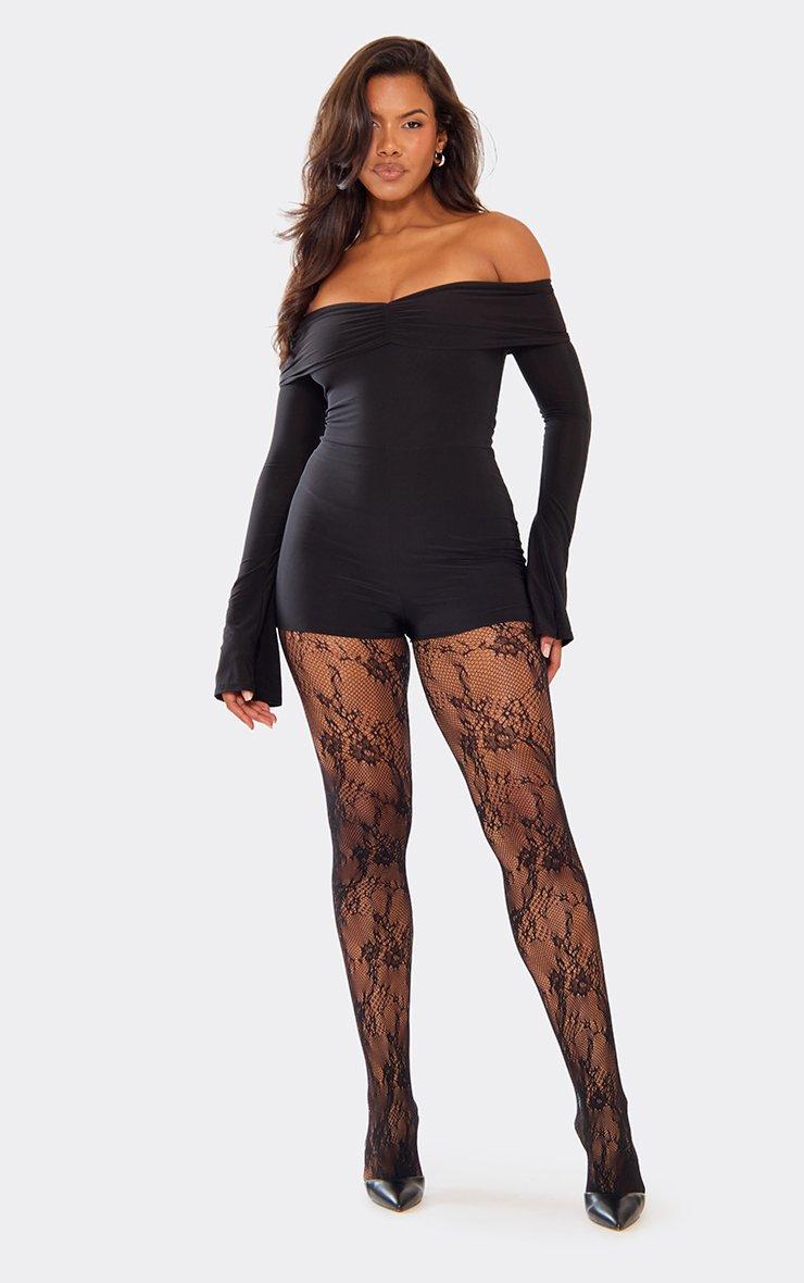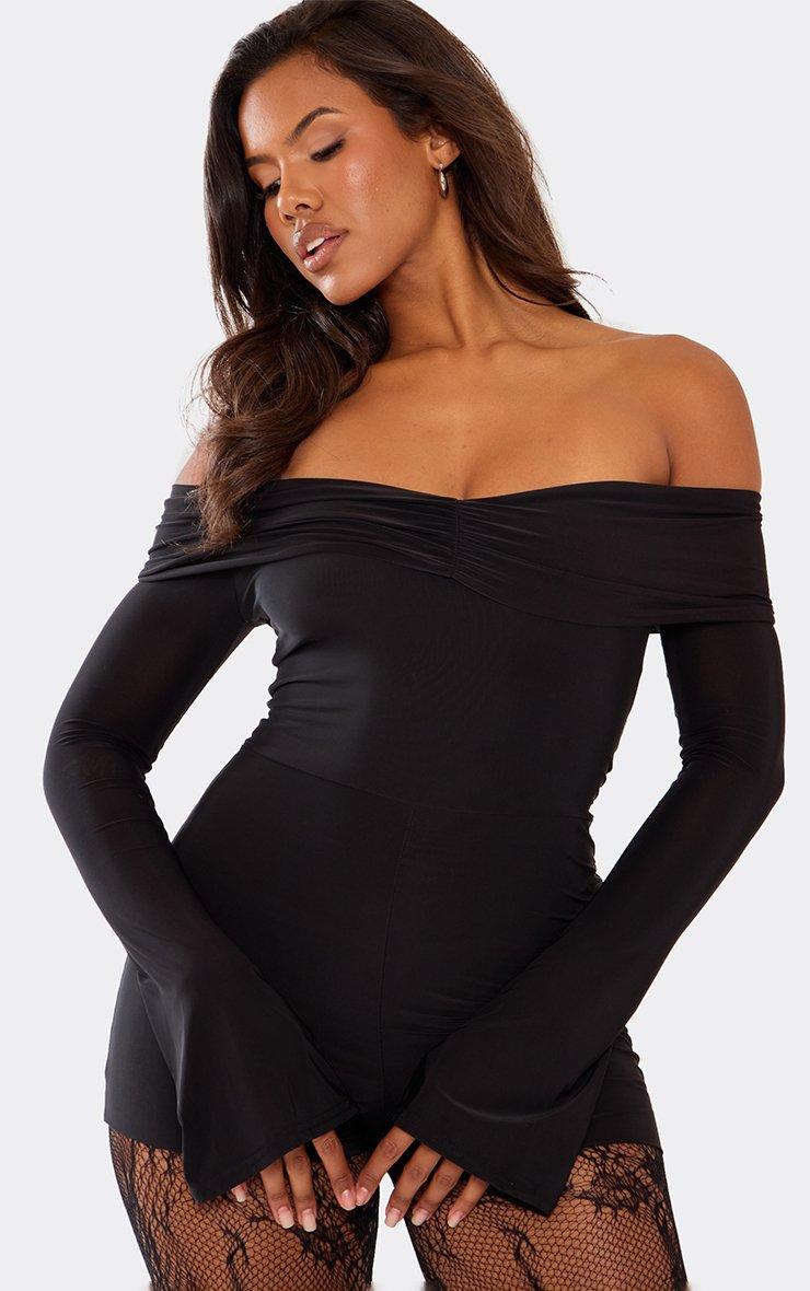 Long Flared Sleeve Bardot Ruched Front Playsuit In Black