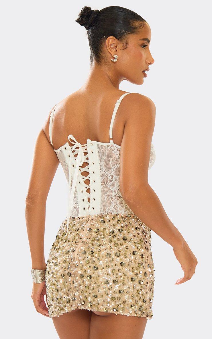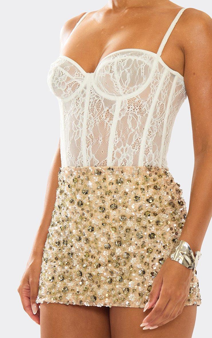 Mid Rise Tie Side Detail Micro Mini Skirt In Nude And Silver Sequin