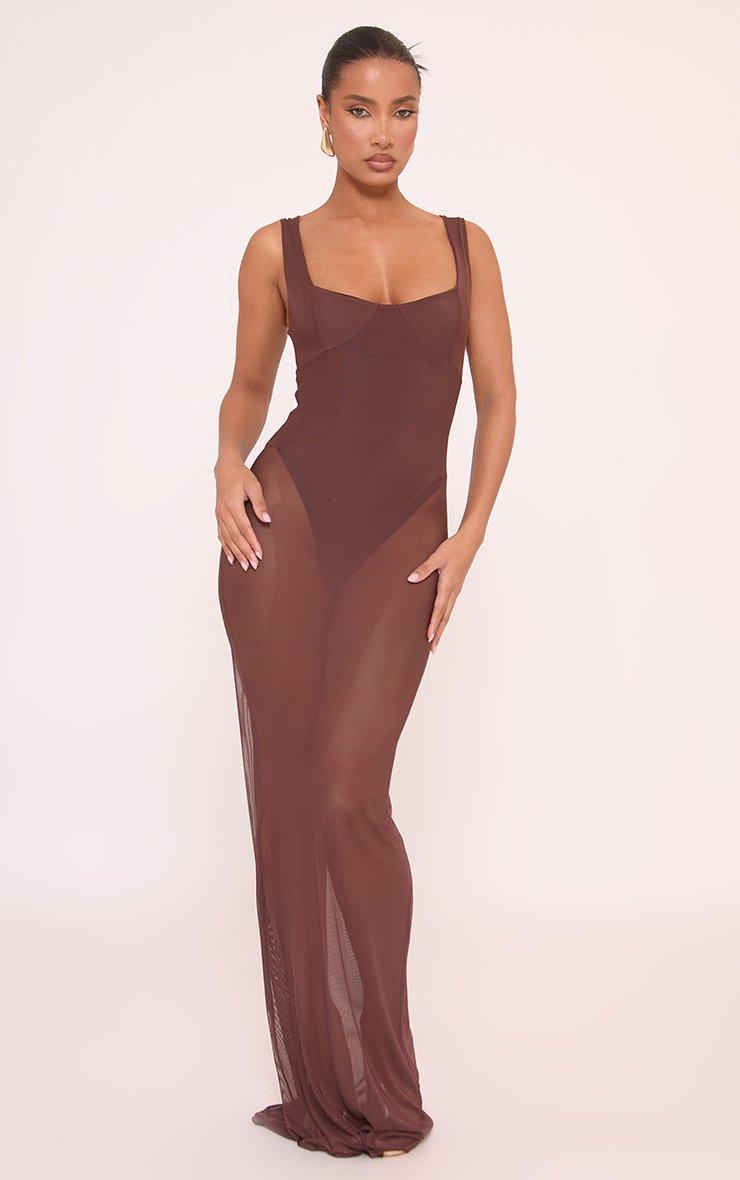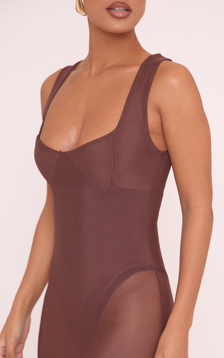 Scoop Neck Bodysuit Insert Dress In Brown Mesh
