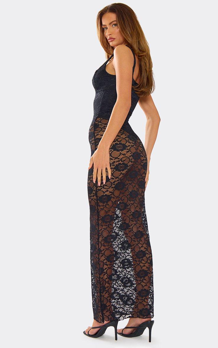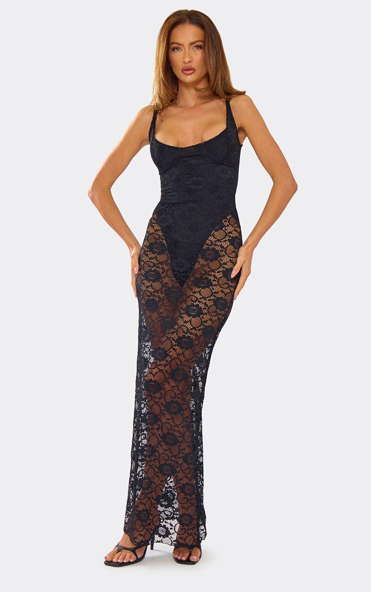 Scoop Neck Bodysuit Insert Maxi Dress In Black Lace