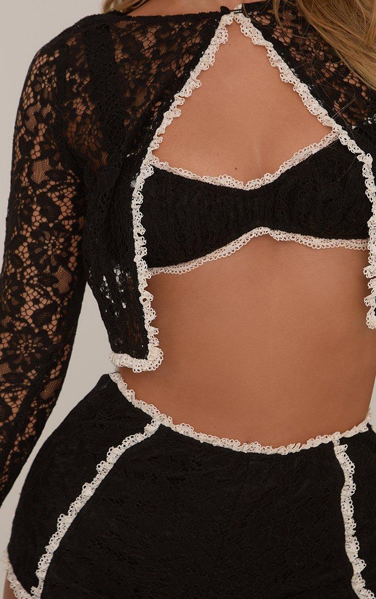 Long Sleeve Contrast Frilled Trim Detail Cardigan In Black Lace