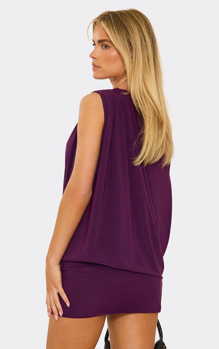 Off The Shoulder Draped Asymmetric Mini Dress In Plum Slinky