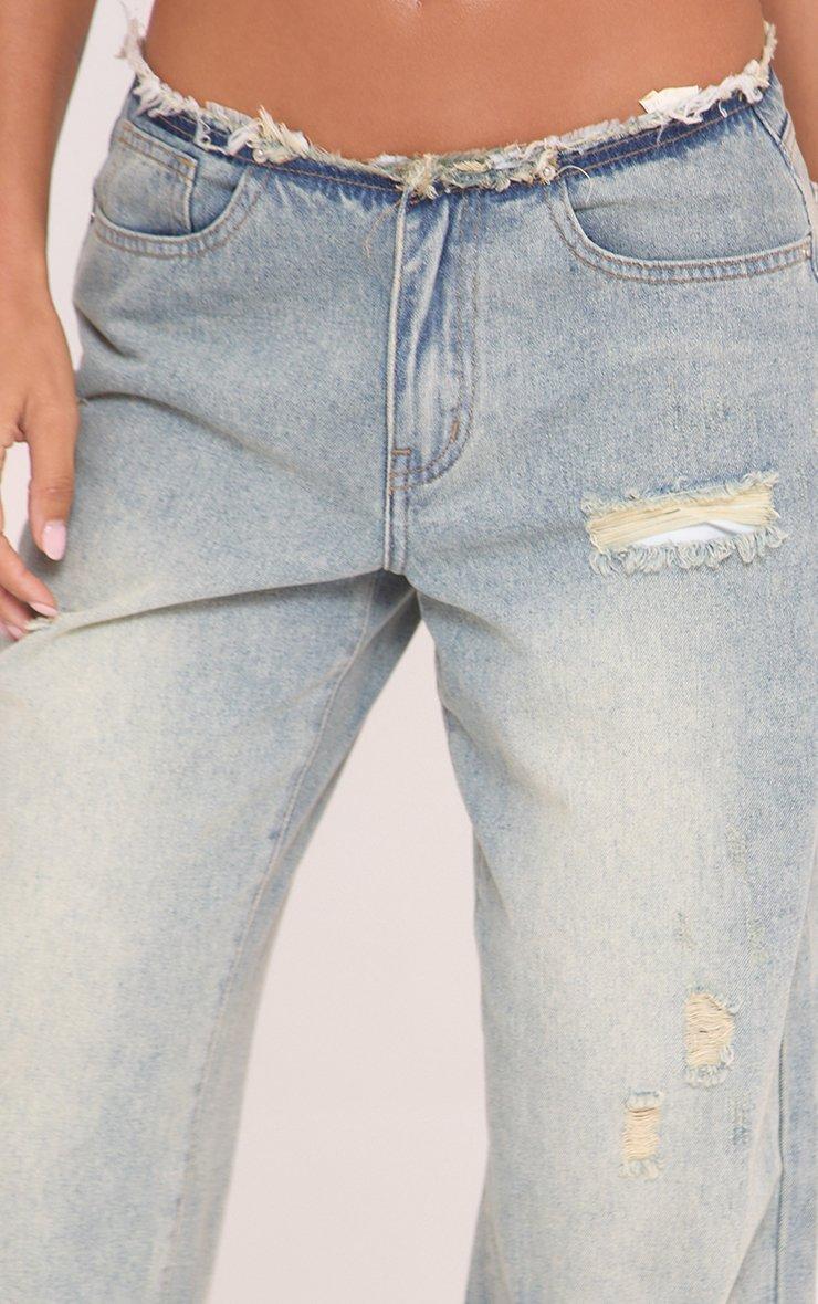 low rise frayed distressed hem detail straight leg jeans in blue denim