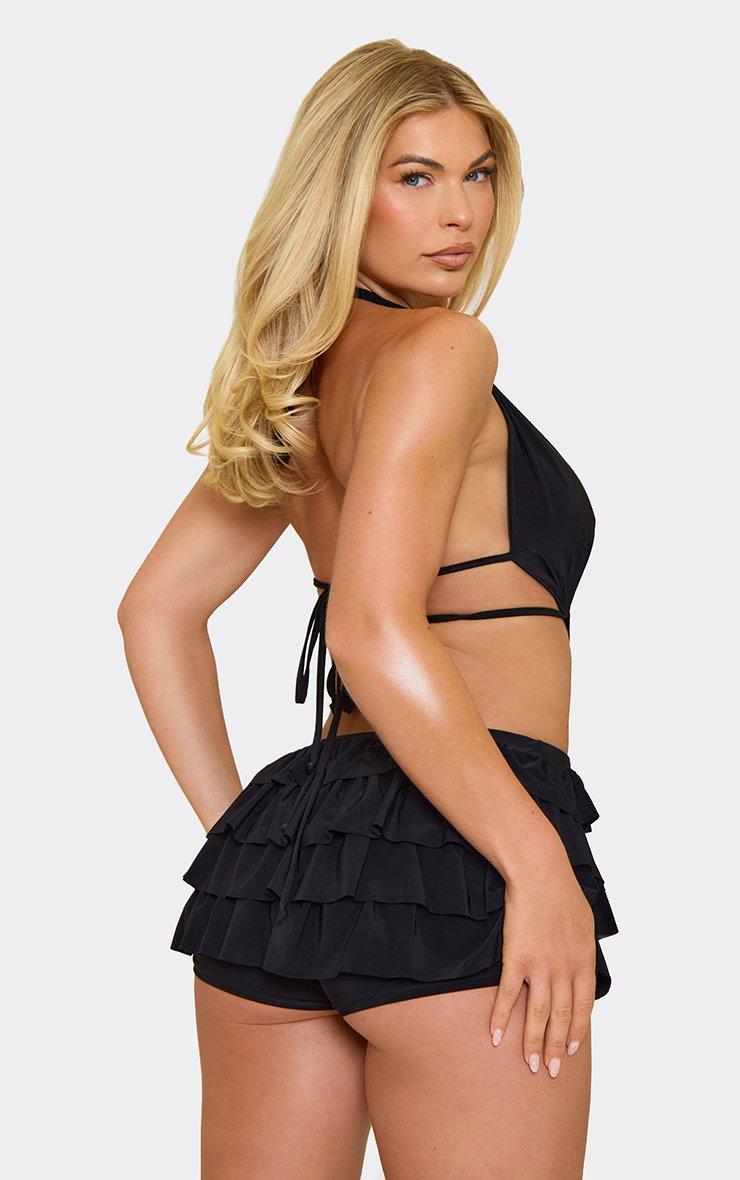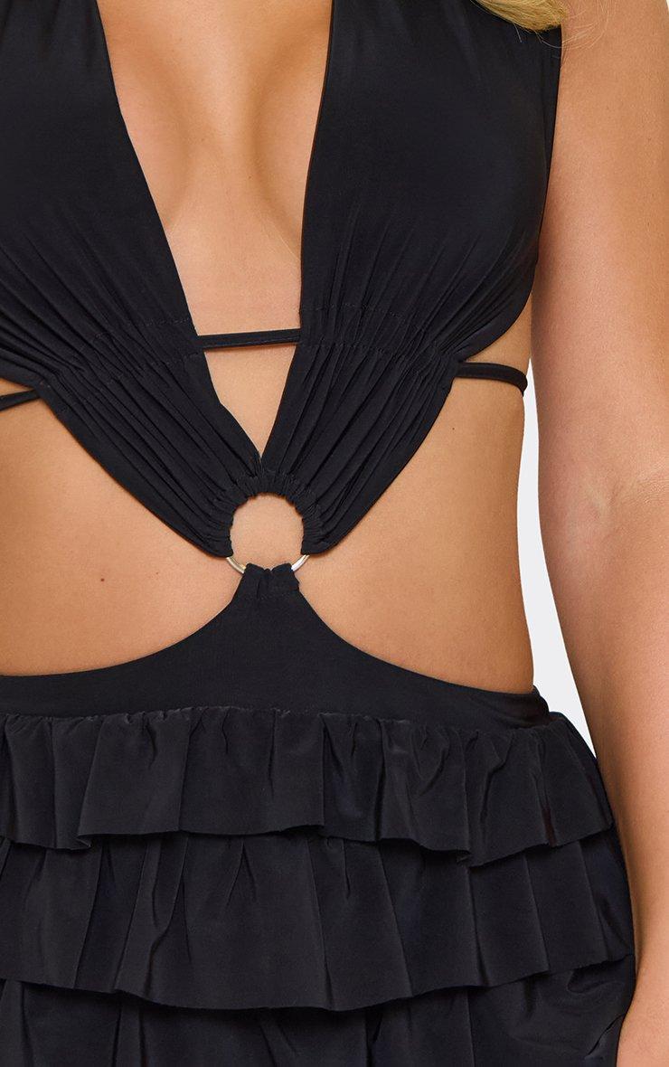 halterneck cut out ring detail frill layered playsuit in black