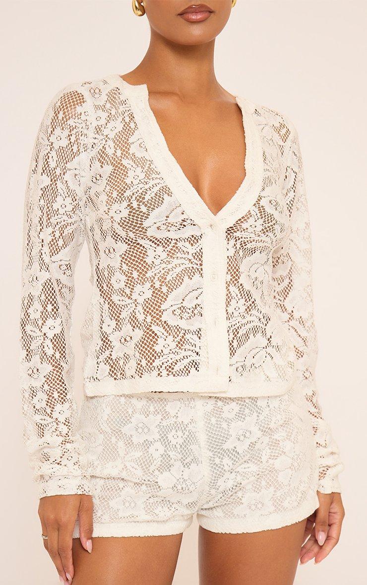 Long Sleeve Button Front Plunge Front Top In White Texture