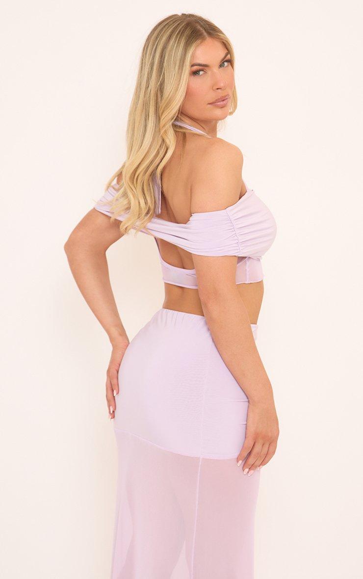 Halter Neck Bardot Tie Detail Contrast Crop Top In Purple Mesh