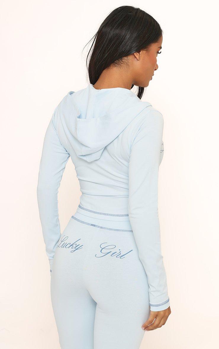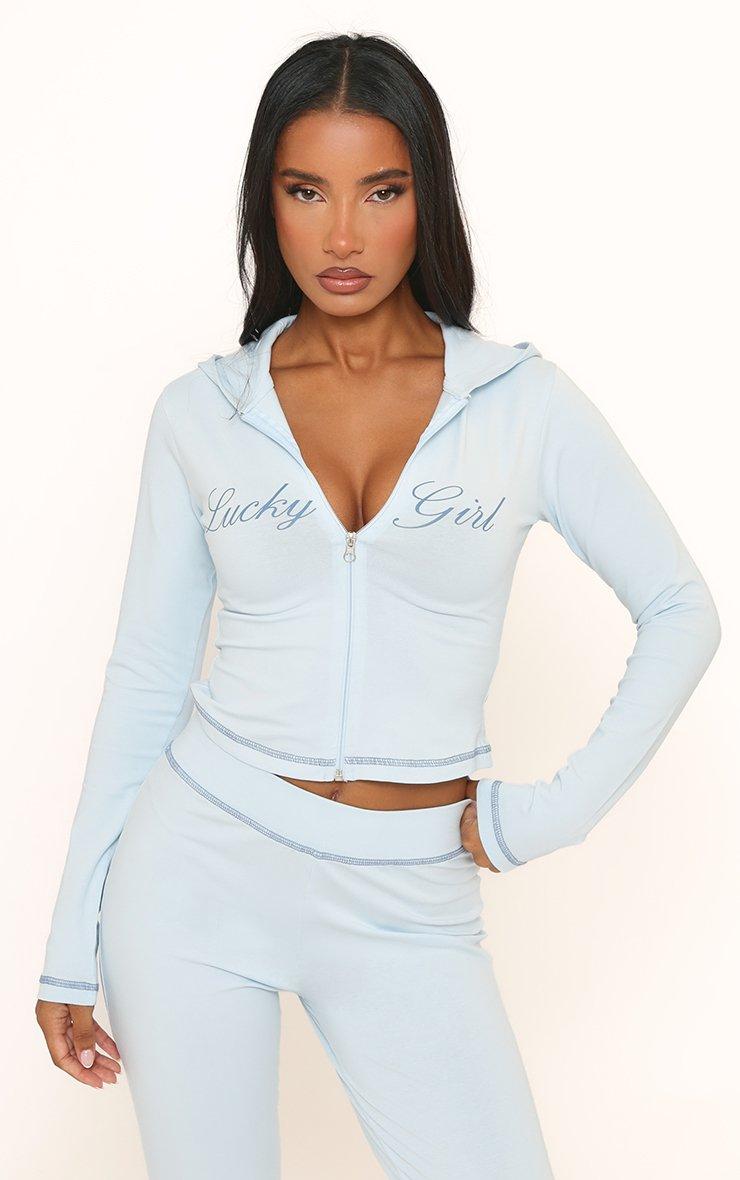 Long Sleeve 'Lucky Girl' Graphic Detail Zip Up Front Fitted Hoodie In Blue