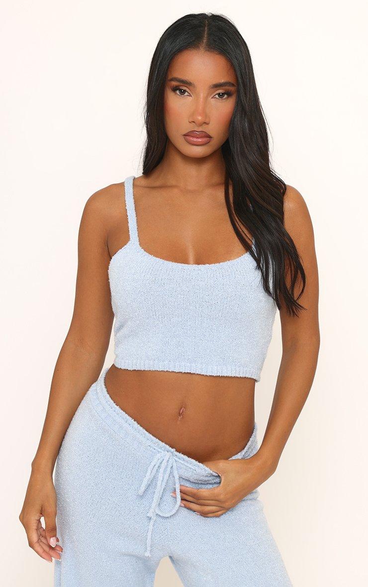 Scoop Neck Strappy Top In Blue Boucle Knit