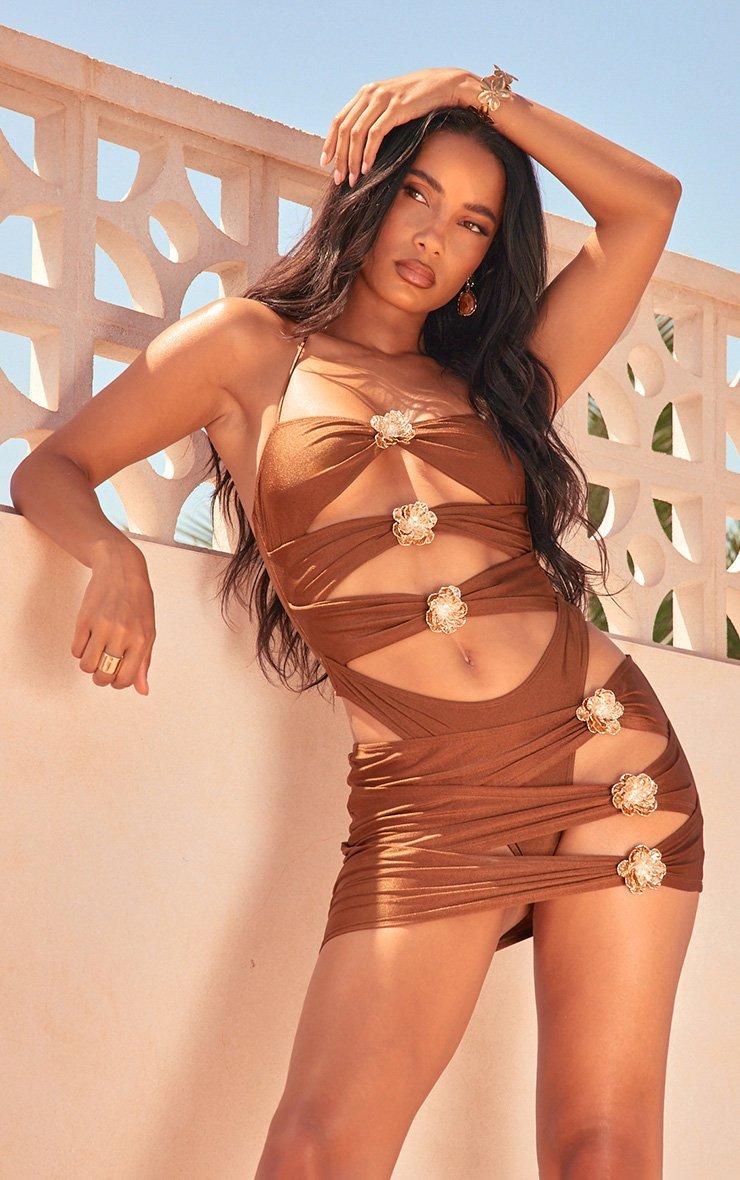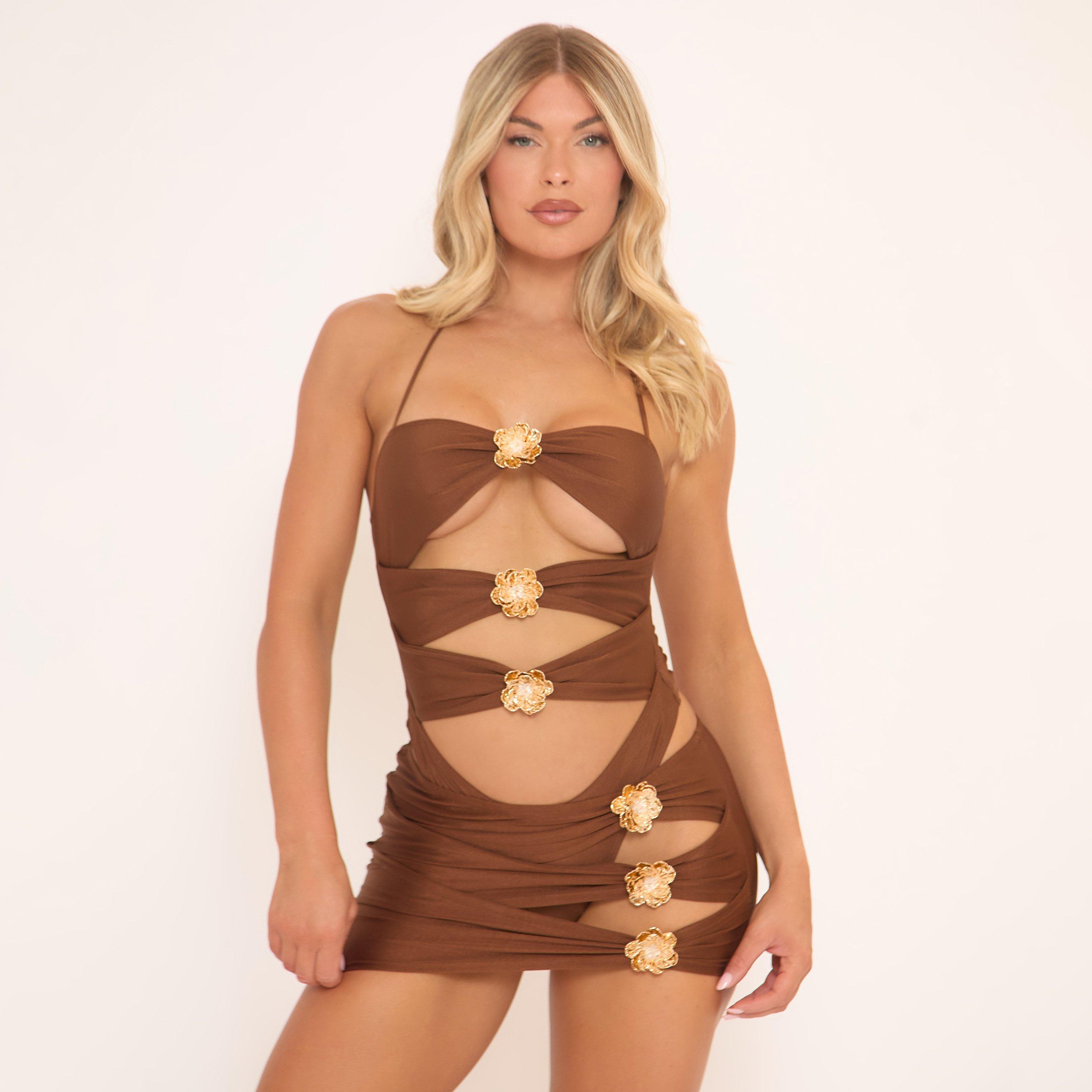 Halterneck Cut Out Front Bead Trim Detail Swimsuit In Brown