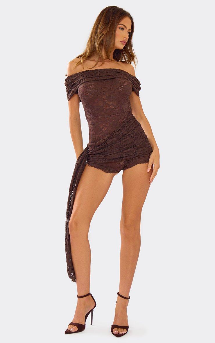 Flared Sleeve Bardot Ruched Front Detail Playsuit In Brown