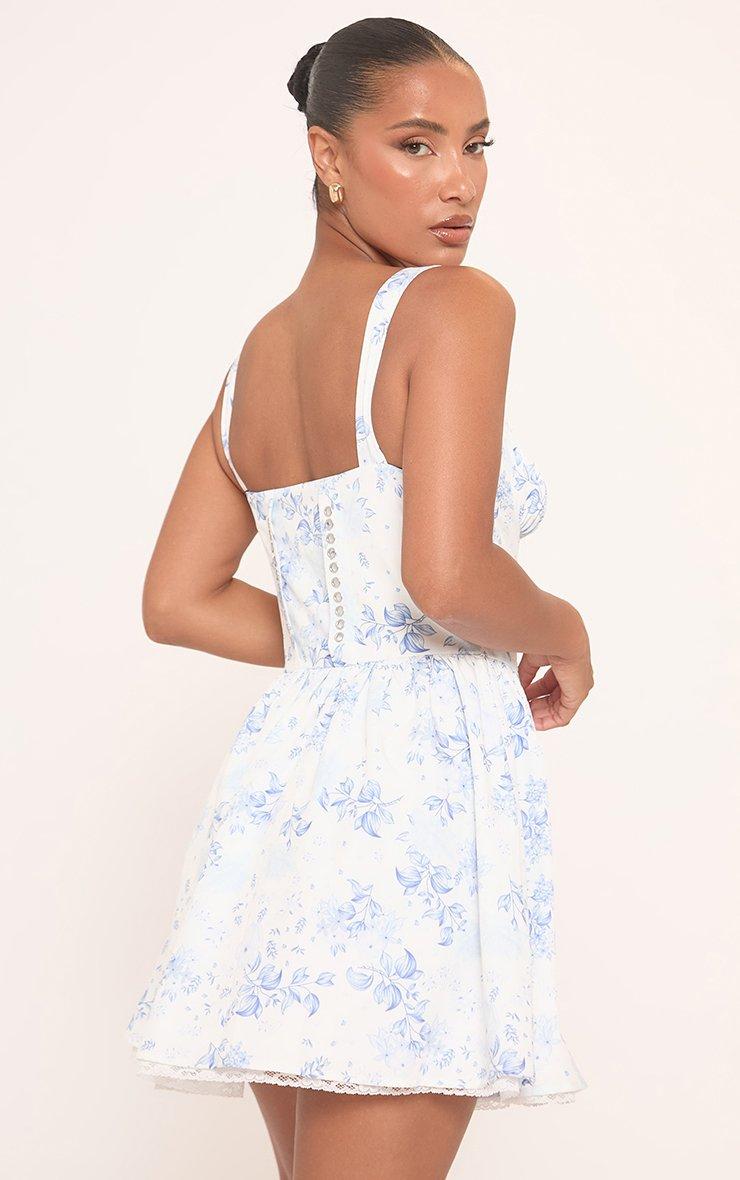 Square Neck Ruched Bust Lace Up Back Mini Dress In Blue Floral Print