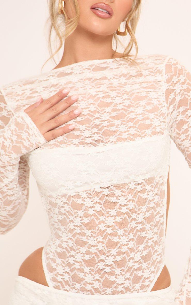 Long Sleeve Ruched Detail Open Back Bodysuit In White Lace