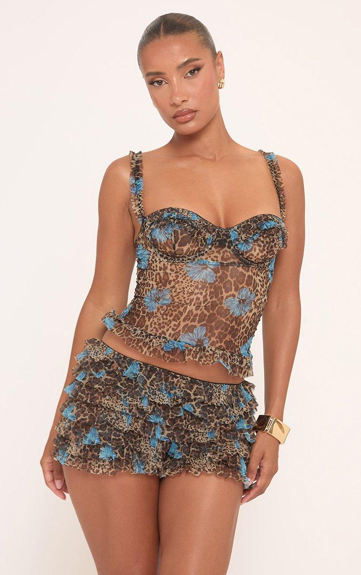 Low Rise Frilled Booty Shorts In Blue Leopard Print Mesh