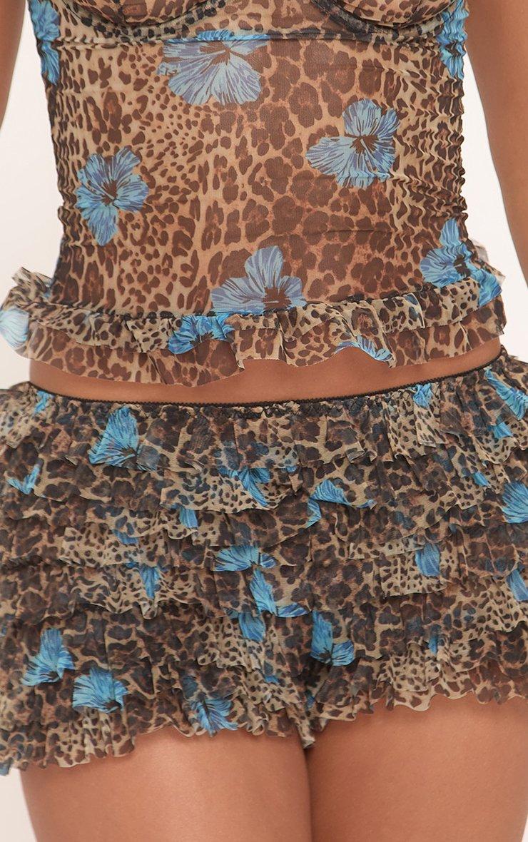 low rise frilled booty shorts in blue leopard print mesh