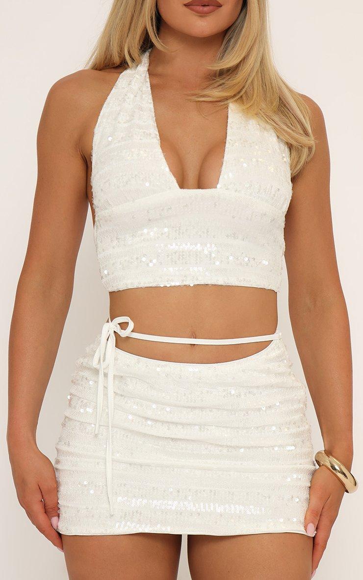 Plunge Halterneck And Tie Waist Mini Skirt Co-Ord Set In Cream Sequin