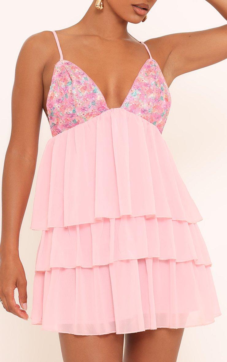 strappy plunge neck sequin bust layered frill mini dress in pink