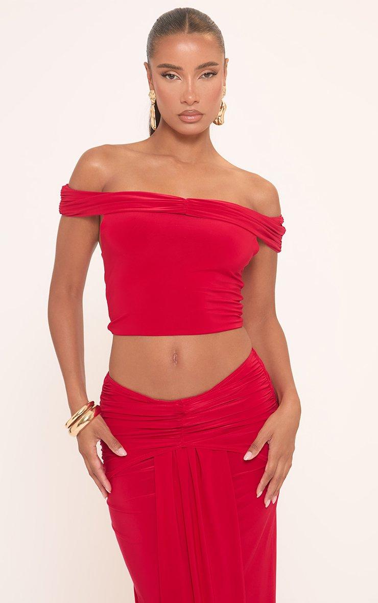 Bardot Ruched Detail Crop Top In Red Slinky